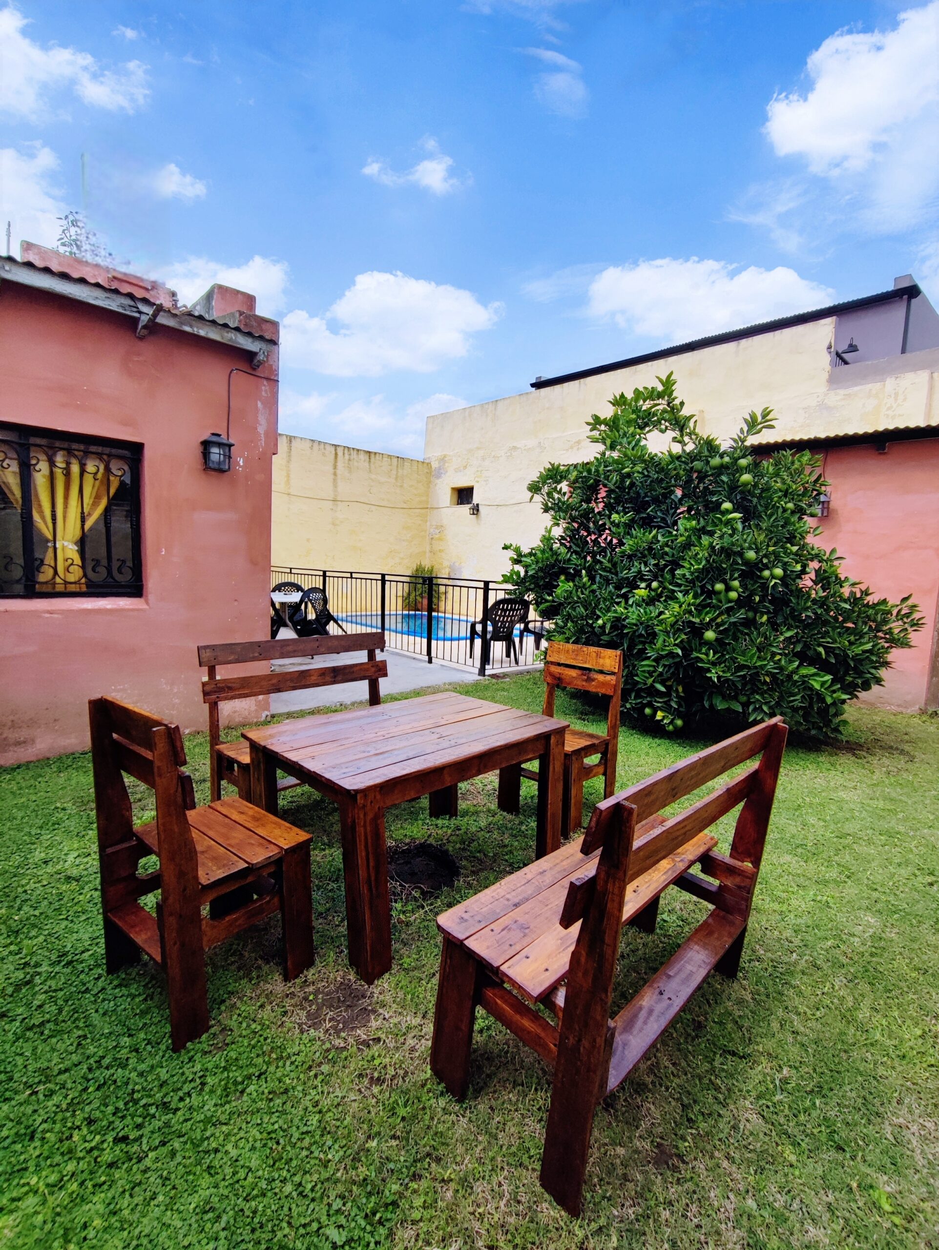 El corazón de Don Floreal late en su patio. Bajo la sombra del naranjo, la mesa de madera y los bancos invitan a compartir charlas, mates y momentos simples que se vuelven inolvidables. Es el rincón perfecto para desayunar al sol, leer un rato o disfrutar del perfume de los azahares cuando florece el árbol. Un espacio donde el tiempo se detiene y la calma de Areco se siente en cada detalle.
